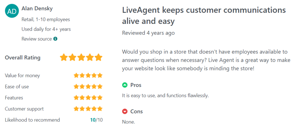 “Would you shop in a store that doesn’t have employees available to answer questions when necessary? LiveAgent is a great way to make your website look like somebody is minding the store!”