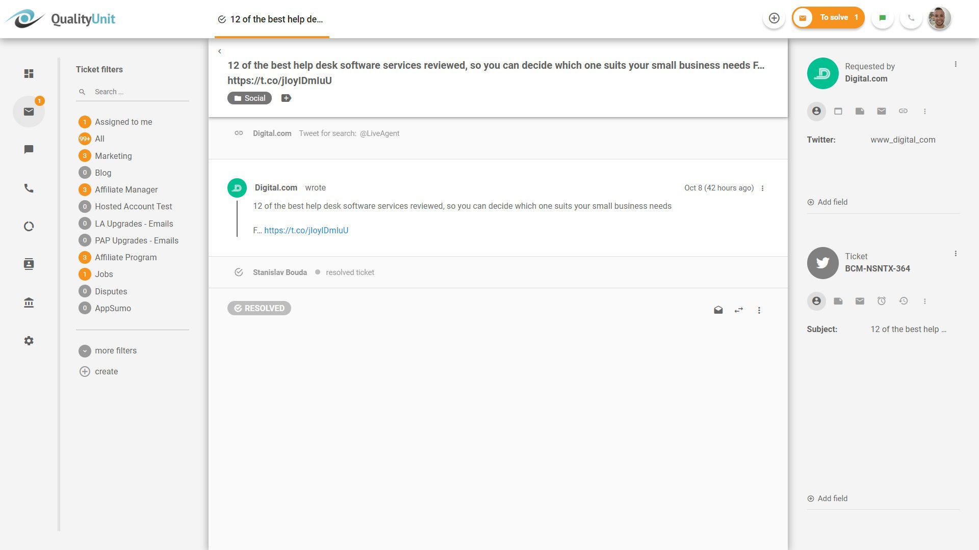 A Twitter integration that fetches all comments and mentions and transforms them into tickets. The integration also enables users to answer all comments and mentions from the social media help desk software.